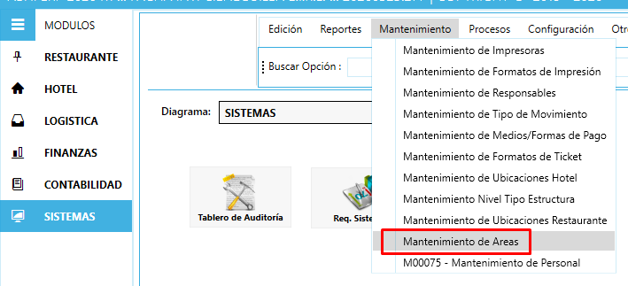 1) Ingresar al módulo de Sistemas,  Menú Mantenimiento y Opción "Mantenimiento de Areas"