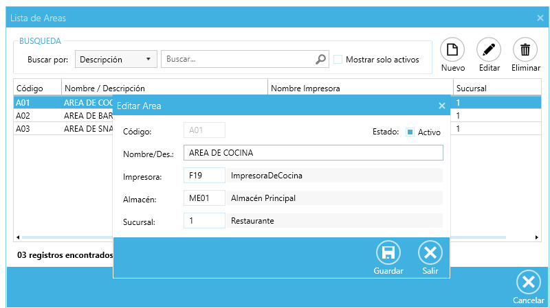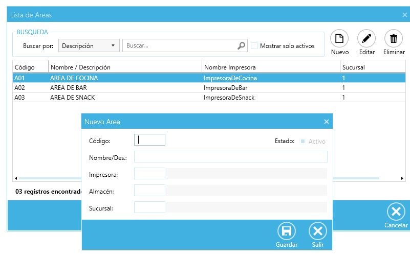 Esta pantalla permite visualizar, crear, editar y eliminar áreas dentro del sistema, las cuales están asociadas a impresoras.