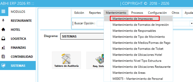 1) Ingresar al módulo de Sistemas, Menú Mantenimiento y Opción "Mantenimiento de Impresoras"