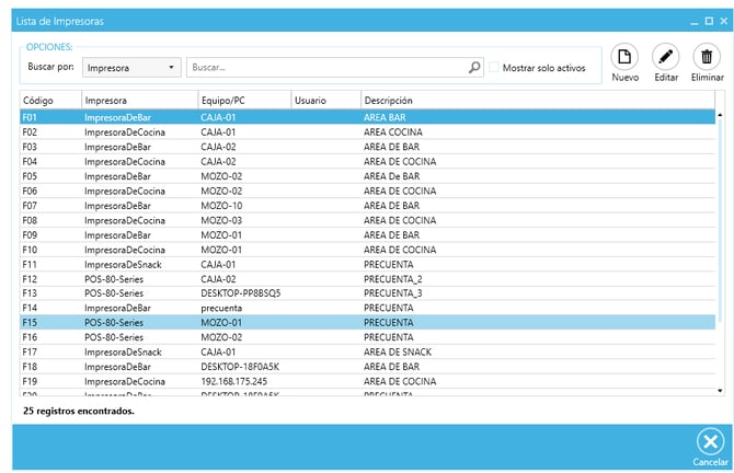 2) Se abre el listado de Impresoras , donde se podrá crear , editar o eliminar.