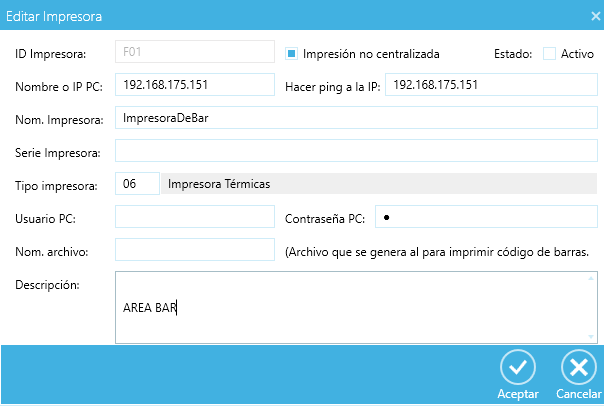 Tipo impresora: seleccionar el tipo de impresora (ejemplo: “Impresora Térmica”)