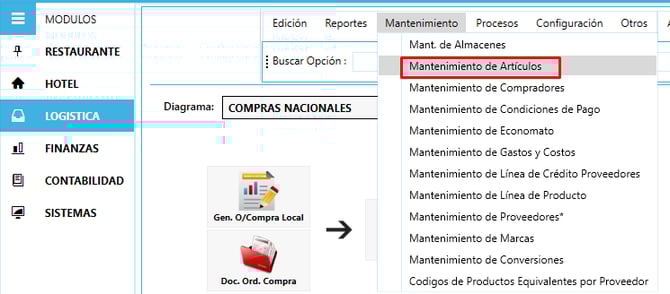 1) Ingresar al módulo de Logística, Menú Mantenimiento y Opción " Mantenimiento de Artículos"