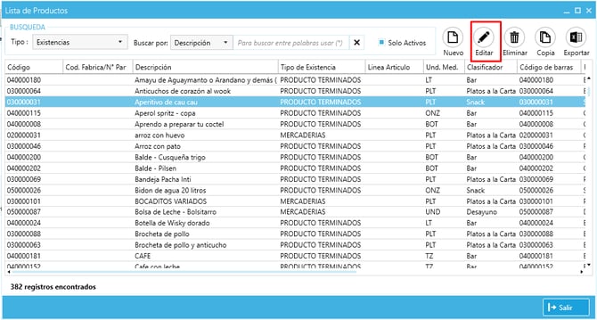 2) Seleccionar el artículo a configurar y clic en el botón "Editar" .