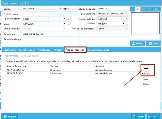 3) Selecciona la pestaña “Área de Producción” y "Agregar"para configurar el destino al que se enviará la comanda según el área correspondiente