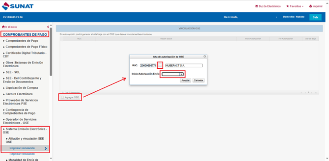 En la ventana Alta de atorización de OSE, registrar los campos solicitados: