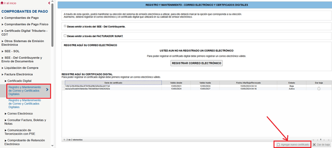 3.1.- Ingrese a Clave SOL en la web de SUNAT y diríjase a: Comprobantes de Pago → Factura Electrónica → Certificado Digital → Registro y Mantenimiento de Correo y Certificados Digitales.