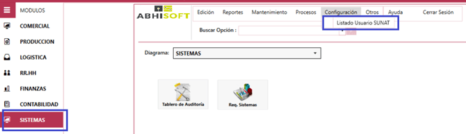 4.1.- Ingrese al Módulo de Sistemas, Menú Configuración → Listado de Usuario SUNAT.