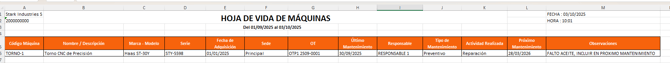 3.- Una vez exportado el reporte desde el sistema, se generará automáticamente un archivo en formato Excel, estructurado como tabla. Este documento presenta el Reporte de Hoja de Vida de Máquinas dentro del rango de fechas previamente seleccionado.