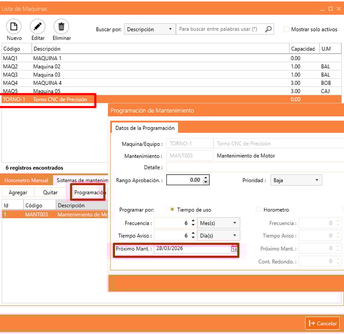 8.- El Próximo mantenimiento se obtiene de la fecha que se configura en la ventana de "Programación de Mantenimiento" , dentro del "Mantenimiento de Máquinas".