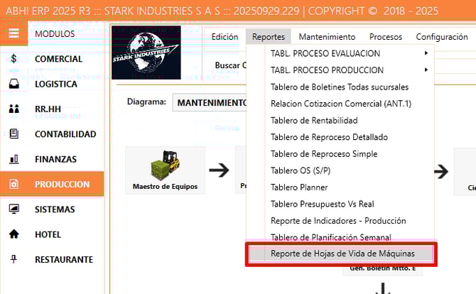 1.- Acceda al Módulo "Producción", seleccione Menú "Reportes" y elija la opción "Reporte de Hoja de Vida de Máquinas".