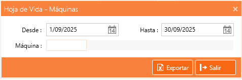 2.- La ventana mostrada permite al usuario consultar los registros del reporte de forma específica, definiendo un rango de fechas , los cuales se aplican sobre la columna “Último Mantenimiento realizado”; además, brinda la opción de filtrar por máquina para visualizar únicamente sus intervenciones en el periodo seleccionado. Para obtener el reporte y poder analizarlo , se debe dar clic en el botón "Exportar".