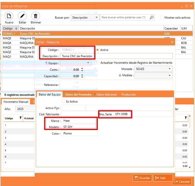 Código de Máquina, Descripción, Marca-Modelo,y Nro de Serie
