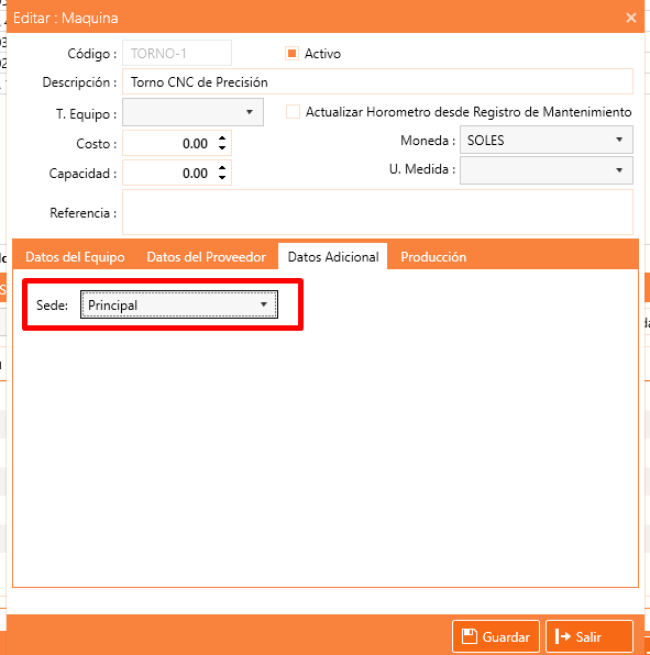 2.- Fecha de Adquisición se extrae del mismo mantenimiento en las pestañas "Datos de Proveedor" y la Sede en la pestaña "Datos Adicional".