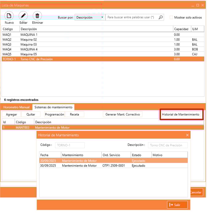 3.- La columna OT saldrá de las ordenes relacionados a esa máquinaria y se puede visualizar en el Historial de Mantenimiento de las máquinarias.