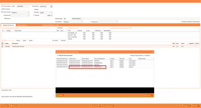 4.- La columna de"Último Mantenimiento" , para este dato debe salir la fecha que se elige al aplicarle el evento de CIERRE y se puede verificar desde el historial de la OT.