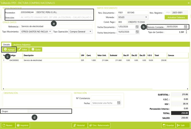 e) Grupo: Utilice esta función para asociar documentos registrados en una misma fecha o destinados a un gasto específico. Esta clasificación permite que, en el módulo de Finanzas, se puedan filtrar rápidamente los comprobantes pertenecientes a un mismo "Grupo" para la emisión y registro de su correspondiente Recibo de Salida.