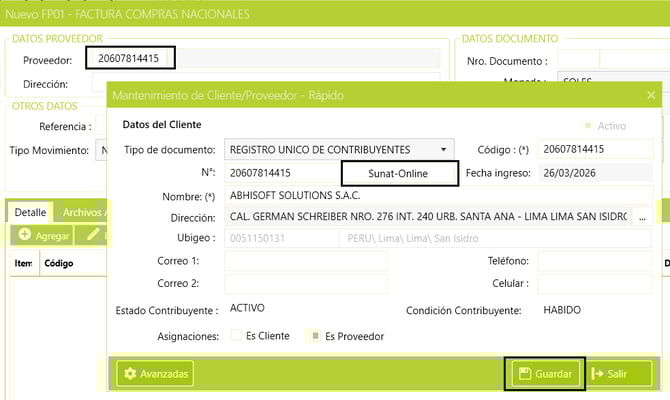 Haga clic en el botón Sunat-Online para extraer automáticamente la información oficial del contribuyente, completar algunos campos como correo y/o teléfonos.
