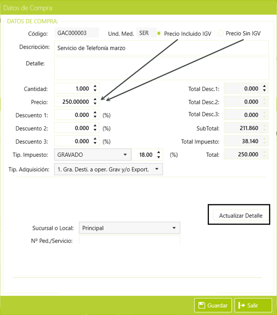 Excepción: Si solo requiere corregir o ampliar la Descripción, utilice el botón ACTUALIZAR DETALLE, el cual es el único campo habilitado para modificaciones en estos casos.