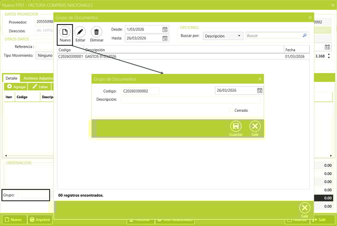 Para seleccionar el Grupo hacer doble clic en el campo y en la lista lo puede buscar por rango de fecha o descripción, si no existe puede crear con el botón nuevo, según imagen: