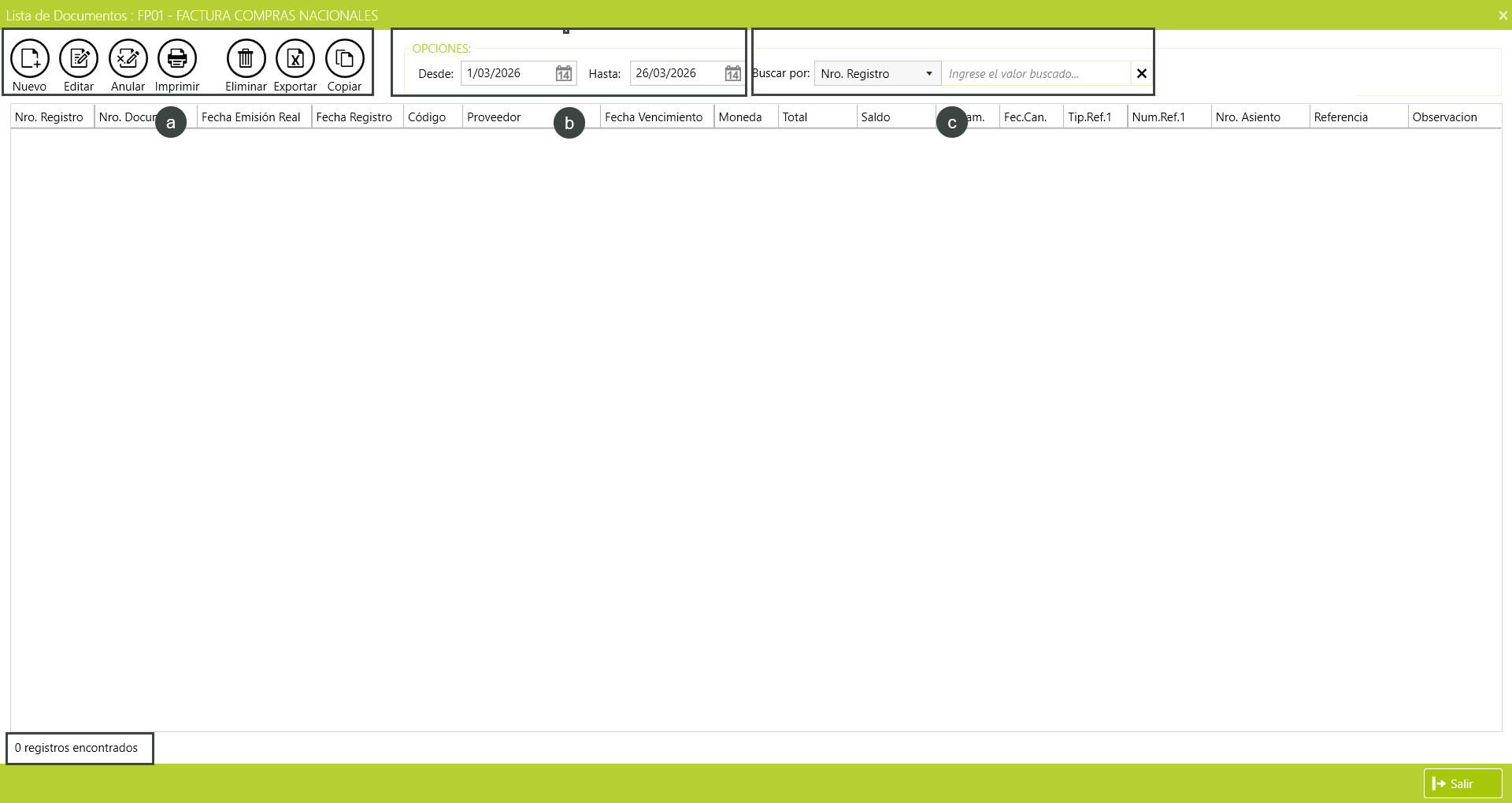 a) Con dichos botones puedes Crear, Editar, Anular, Imprimir, Eliminar, Copiar un documento, y exportar a un excel todos los comprobantes registrados (Diferencia entre Anular y Eliminar es que cuando anulas el documento permanece en la lista pero figura con el nombre ***ANULADO*** y al eliminar desaparece por completo de la lista)